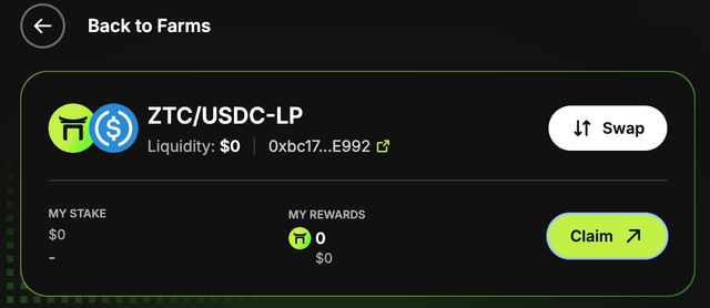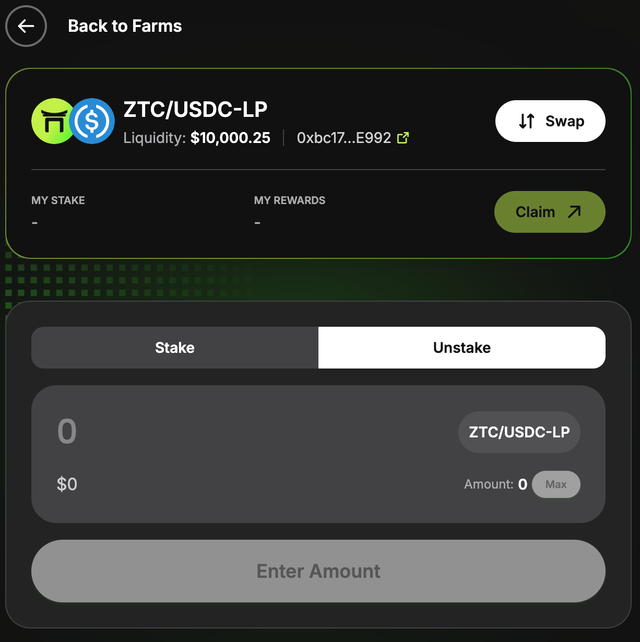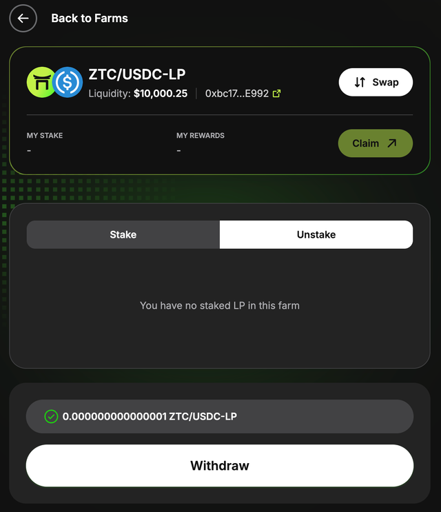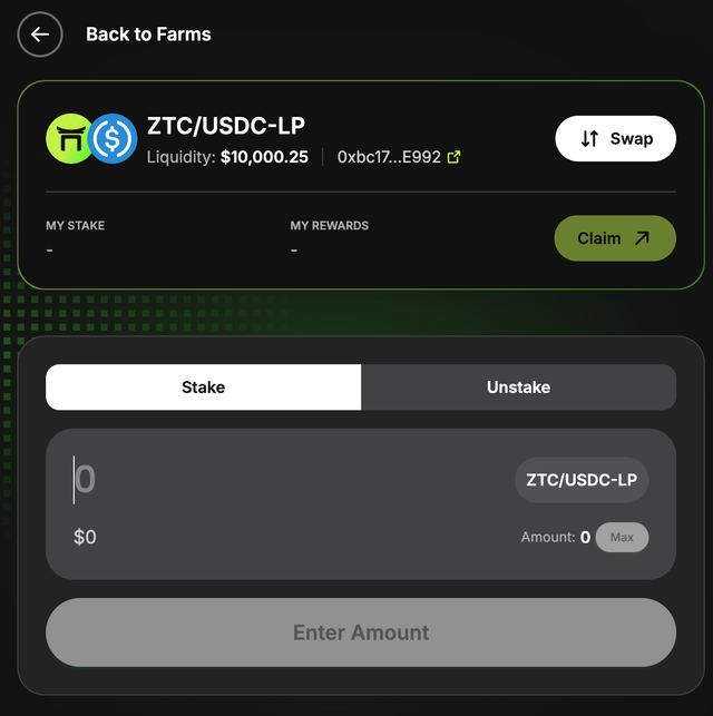 - Effect: Your LP tokens are transferred to the vault, your staked balance increases, and you begin earning rewards. Any pending ZTC rewards are claimed and any pending slashes are applied before the new amount is added.