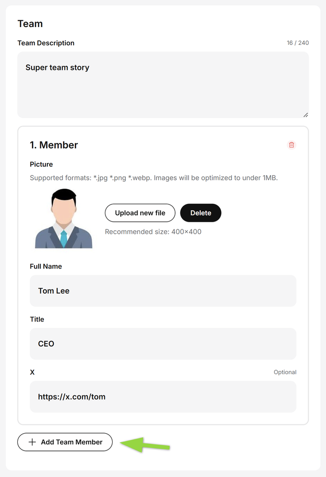 - Members (photo 400×400 recommended, name, role, socials)