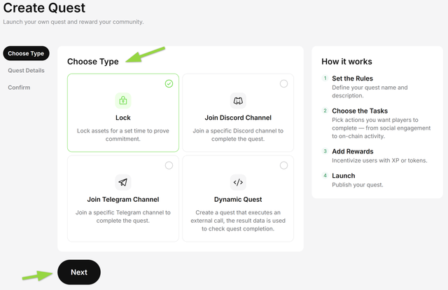 Quests drive engagement and distribute rewards from the Quests Vault. Create a mix of staking tasks and social or Dynamic Quests.