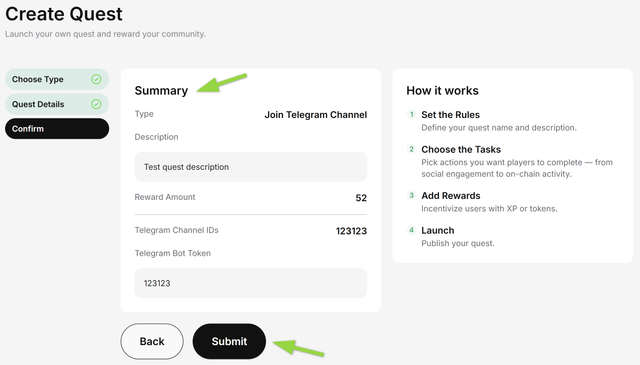 - Review the quest data and click on Submit.